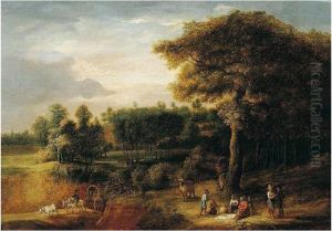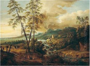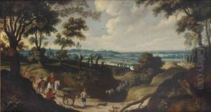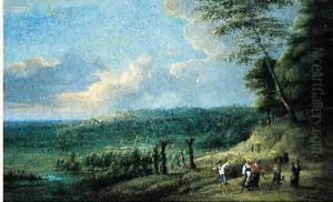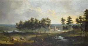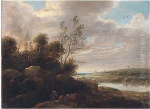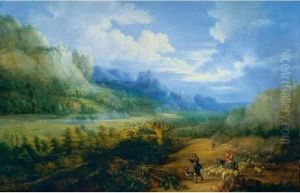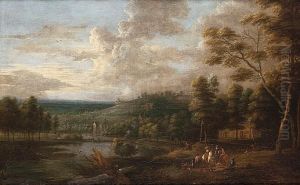 An Extensive Wooded River Landscape With Peasants, Sheep And Goats In The Foreground, A A View Of A Valley In The Distance