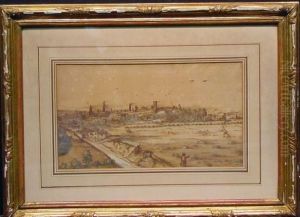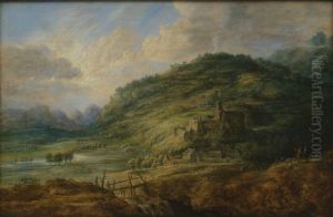 An Extensive Mountainous Landscape With A Fortune Teller And Other Figures On A River Bank