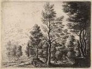 A Wooded Landscape With A Shepherd And His Flock At A Well