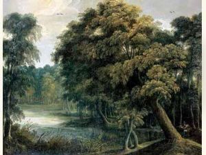 An Extensive Wooded Landscape With A Hawking Party Beside A Lake In The Foreground