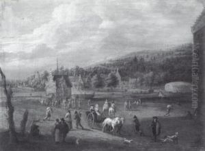 An Extensive River Landscape With A Peasant Couple In The Foreground, A Village Kermesse Beyond