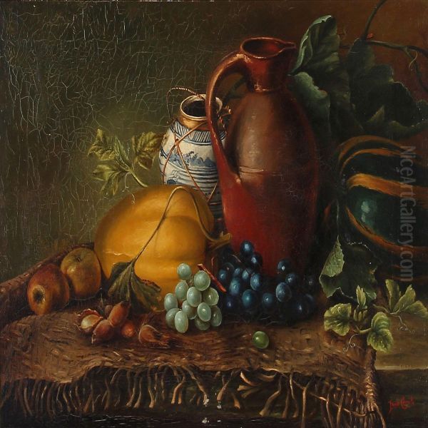 Still Life With Pumpkins, Fruit And Jug On A Table
