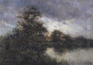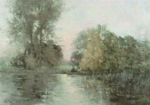 Paysage Brumeux Avec Pecheur Le Long D'un Etang