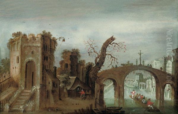 A Capriccio River Landscape With Figures On A Raft Passing Beneath A Bridge