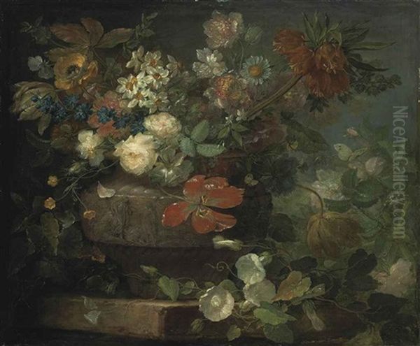 Red And White Roses, Tulips, Blossom And Other Flowers, In A Sculpted Vase, On A Stone Ledge
