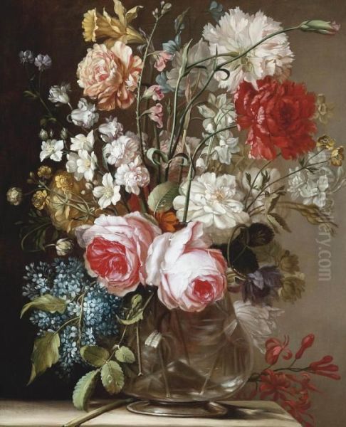 Roses, Narcissi And Other Flowers In A Vase On A Stone Plinth