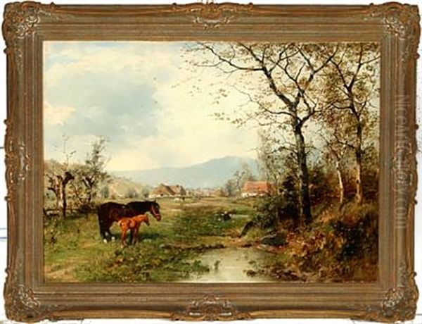 Autumn Landscape With Horses Near A Village