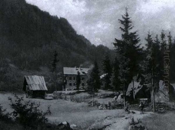 Gebirgslandschaft Mit Rastenden Jagern Nahe Einem Gehoft