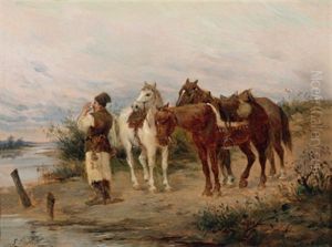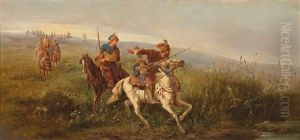 Abend In Der Puszta. Husaren Treiben Eine Herde Pferde An