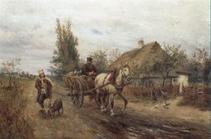 Pferdefuhrwerk Mit Bauern Und Hunden Vor Einem Bauernhaus