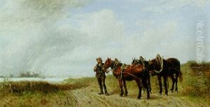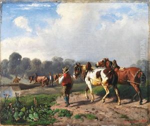 Man With Three Horses By A River