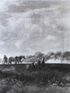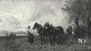 Rastende Bauern Mit Pferden Und Hund Am Waldrand