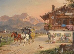 Bauernpaar Und Pferde Auf Der Landstrase Vor Dem Gehoft