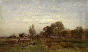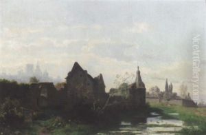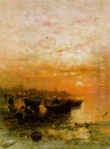 Wascherinnen Am Flusufer Vor Einer Stadt. Abendstimmung
