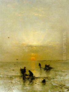 Hunters With Their Dogs In A Winter Landscape At Sunset