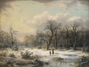 Winterlandschaft Mit Knorrigen Eichenbaumen Vor Einer Kirche In Der Waldlichtung Und Figurenstaffage