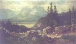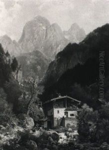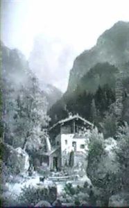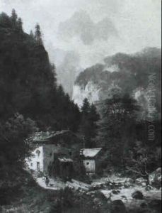 Oberbayerische Landschaft Mit Holzhutte Und Kuhen An Der Tranke