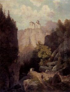 Gebirgsschlucht Mit Bach Und Einem Hirten Mit Seinen Ziegen