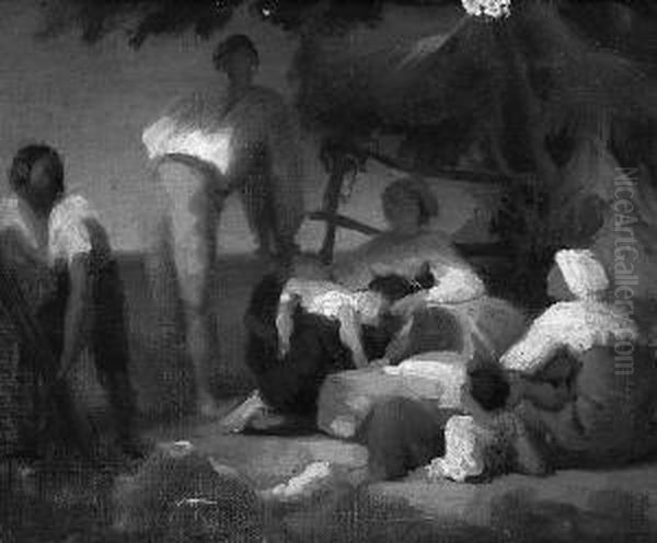 "lagernde Italienische Bauern". Monogr. Th. Olskizze Auf Lwd. Auf Karton. Besch. 21,4 X 27 Cm. Rahmen