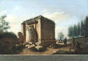 A view of Tyndareus from the South, with figures by a sarcophagus and fragments of scuplture, the ruins of a temple