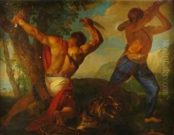 "una Tigre Assalita Da Due Cacciatori" Olio Su Tela Firmato E Datato In Basso A Destra "luigi Sabatelli 1845". Autentica Del Prof. Ferdinando Mazzocca