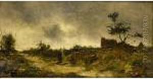 A Peasant Woman Is Leading Her Cow Home During Dust