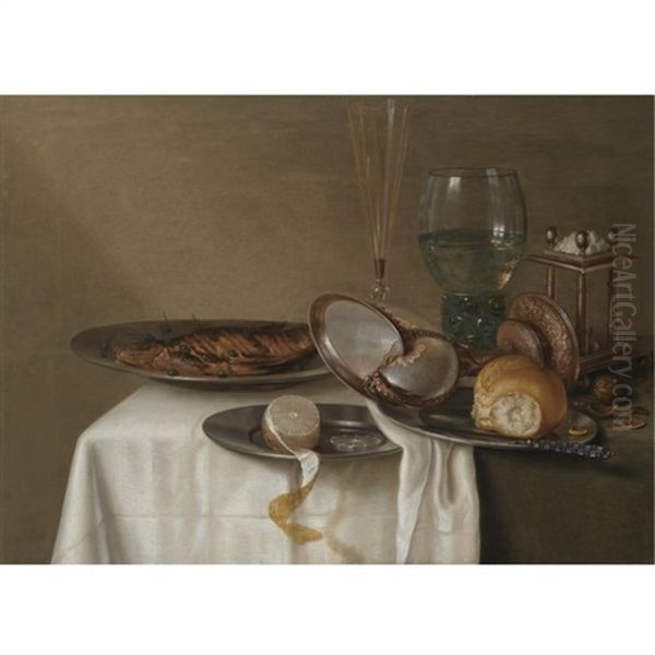A Still Life With A Half-peeled Lemon On A Pewter Dish, A Dried Fish With Capers, A Wine Glass, Roemer, Triangular Salt Cellar And A Nautilus-shell Cup On A Table