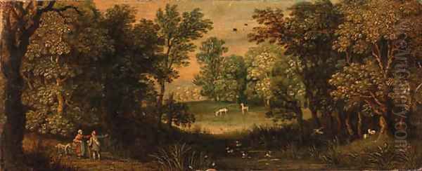 Peasants on a path by a pond in a wood