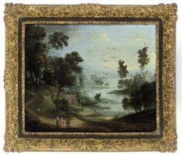 An Extensive River Landscape With Figures On A Track
