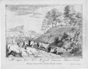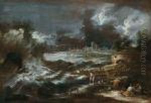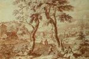 A Lacustrine Landscape With A Herder And His Animals Resting By The Water, A Town Beyond