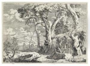 Extensive wooded landscapes with shepherds by a bridge and a lake