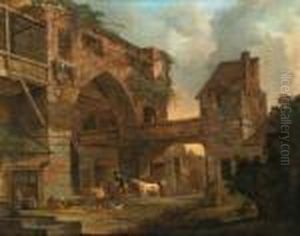 An Architectural Capriccio With Figures, A Man Drinking From A Fountain
