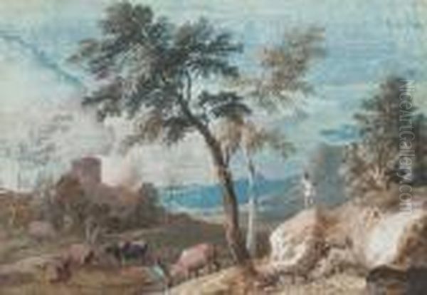 A Drover And His Cattle In An Italianate Landscape With A Castle In The Distance
