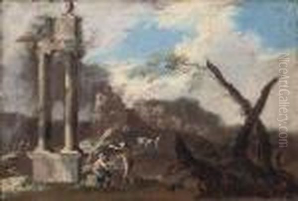 A Landscape With Classical Ruins And Travellers Conversing