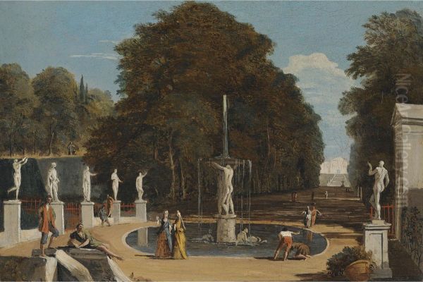 A Landscape With Figures Conversing In A Park Beside A Fountain