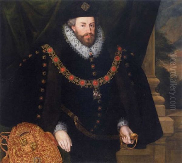 Portrait Of Sir Christopher Hatton Wearing The Garter Chain, And A Fur Lined Coat, His Bag Of Office To The Left