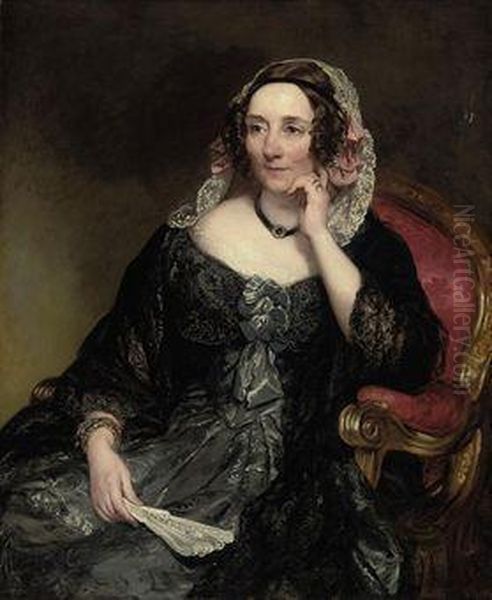 Portrait Of Selina, Lady Fitzwygram, Nee Hayes, Seated In An Armchair, In A Blue Dress With A Black Lace Shawl And Lace Headdress, Holding A Fan