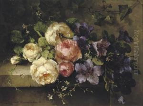 Bouquet De Roses Et De Mauves Sur Une Tablette: A Mixed Bouquet On A Ledge