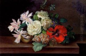 Reiches Herbstliches Stilleben Mit Trauben, Kurbissen, Pfirschen Und Erlegtem Singvogel Vor Einem Blumenstraus