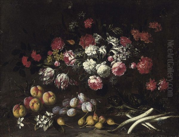 Roses, Tulips And Other Flowers, With Peaches, Plums, Figs, Artichokes And Asparagus