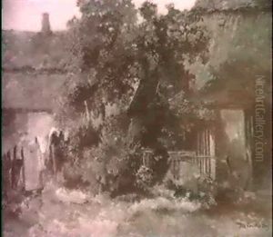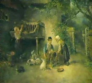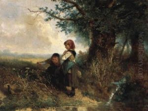 A Summer Landscape With A Child In A Wheelbarrow Watching Geese