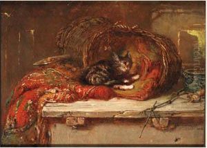 Fish In A Wicker Basket, Spring Onions, Lemons, A Bread, Cherries On A Plate And A Glass Vase, All On A Stone Ledge