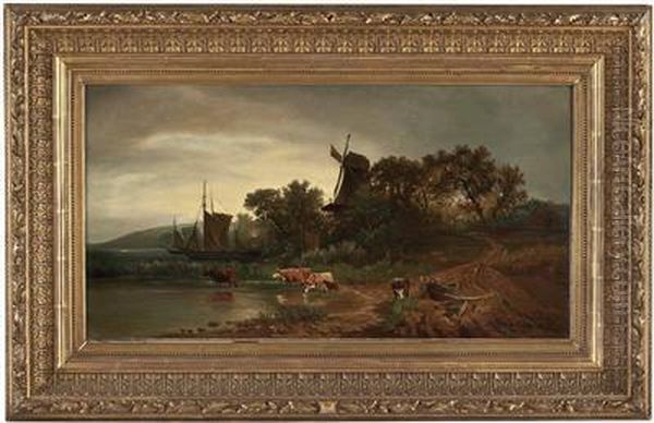 "kuhe Bei Der Tranke Mit Segelschiff Und Windmuhle"