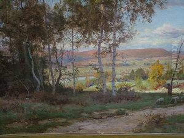 Shepherd With Sheep In A Woodland Glade With Hills Beyond
