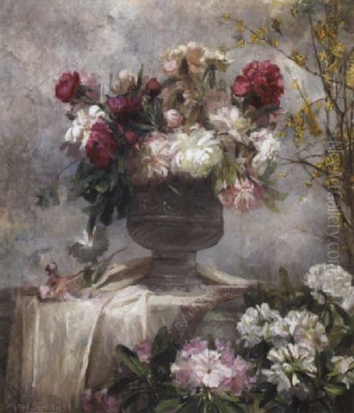 A Still Life With Peonies In An Urn And Rhododendrons On A Ledge Below