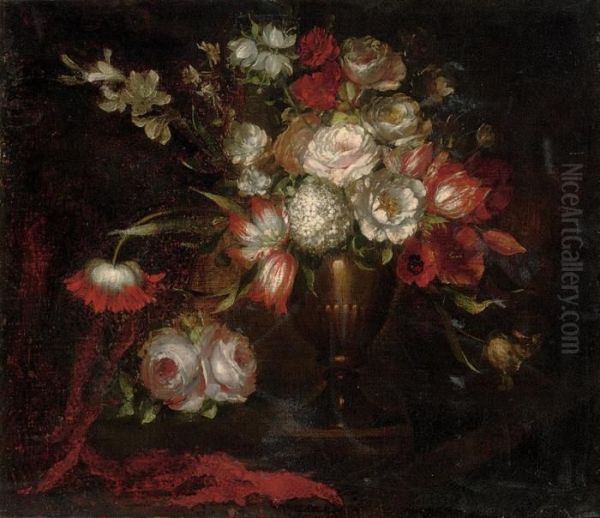 Roses, Tulips, Parrot Tulips, Lilies And Other Flowers In An Urn