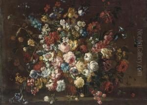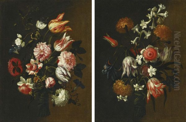 Two Still Lifes With Tulips, Roses And Other Flowers Tied In Bunches