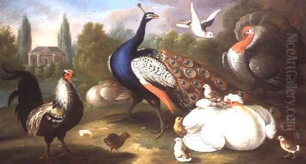 A Peacock, Turkey, Hen, Cockerel and Dove by a River