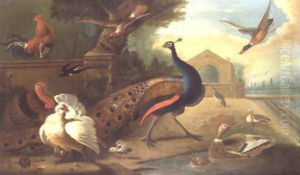 A Peacock, cockerel, turkey and other birds