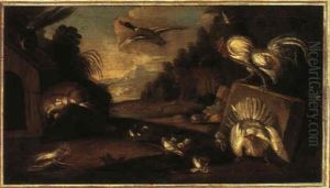 Two Cockerels, A Hen And Otherfowl In A Landscape